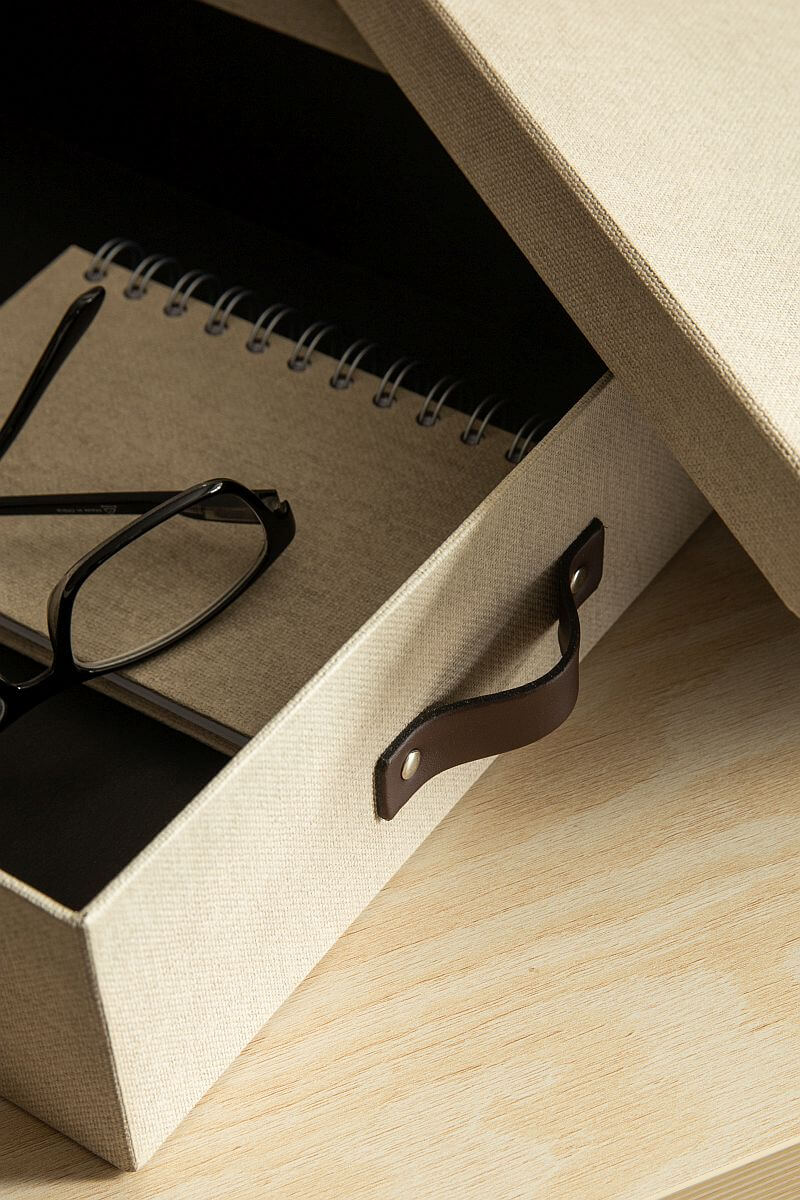 Im Inneren bietet die Box großzügigen Platz für Dokumente, Unterlagen, Notizbücher oder persönliche Schätze. Der verstärkte Aufbau sorgt für Formstabilität, selbst bei häufiger Nutzung, während die klare Linienführung und das ruhige, matte Design für ein aufgeräumtes, harmonisches Gesamtbild sorgen.