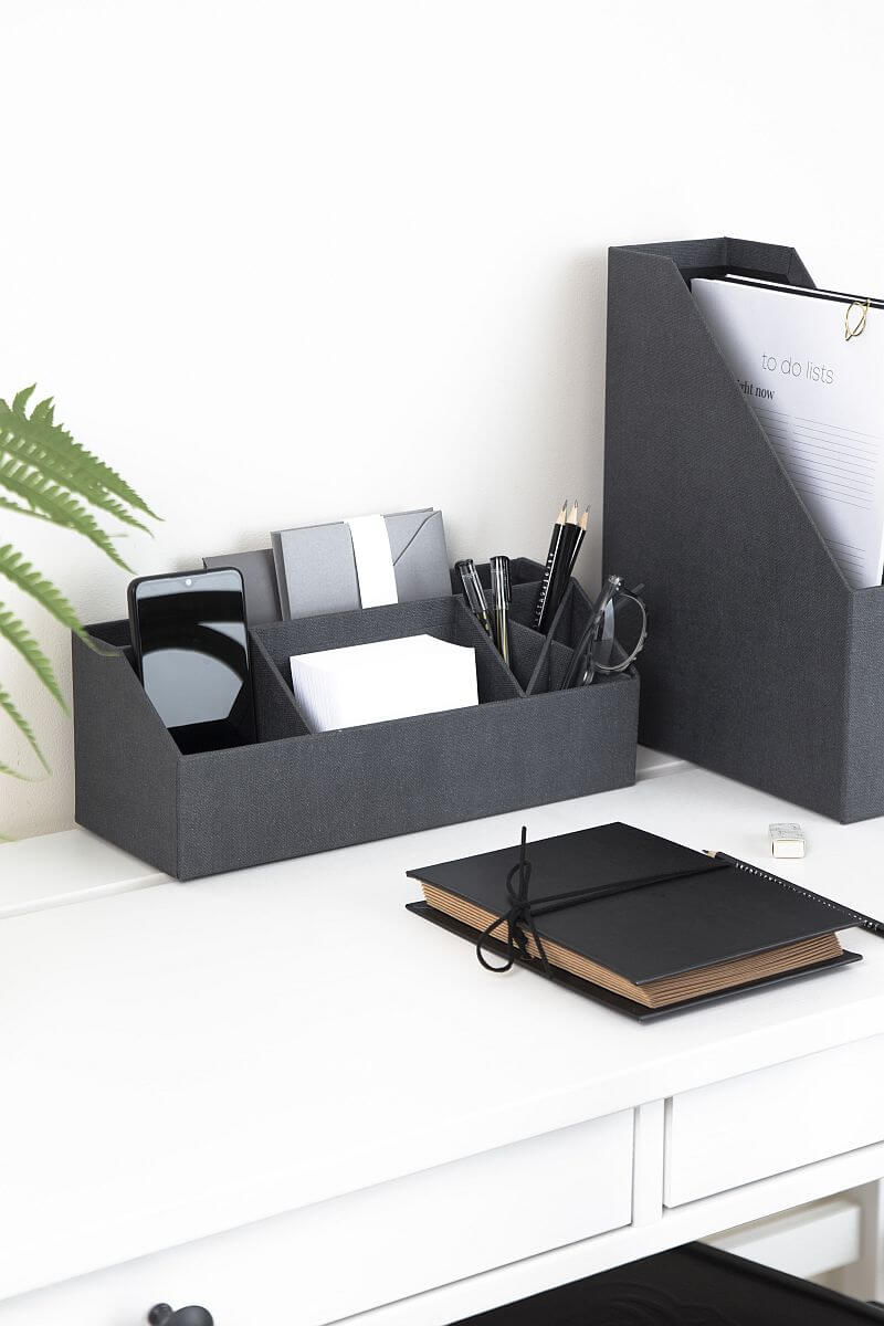 Bringen Sie Stil und Struktur in Ihren Arbeitsalltag: Dieser hochwertige Schreibtischorganizer aus robuster Holzfaserplatte überzeugt durch seine moderne Leinenoptik und fügt sich harmonisch in jedes Büro- oder Home-Office ein.