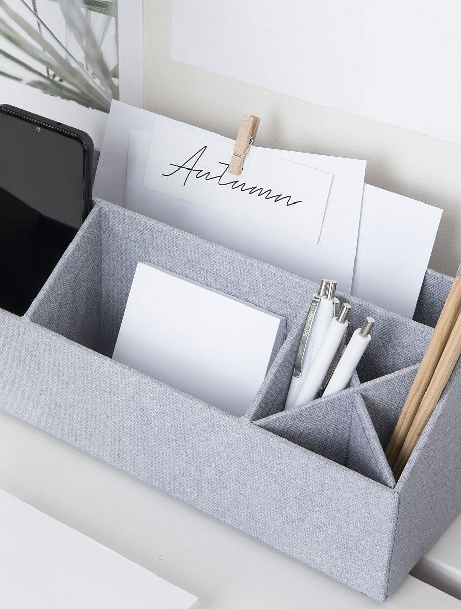 Bringen Sie Stil und Struktur in Ihren Arbeitsalltag: Dieser hochwertige Schreibtischorganizer aus robuster Holzfaserplatte überzeugt durch seine moderne Leinenoptik und fügt sich harmonisch in jedes Büro- oder Home-Office ein.